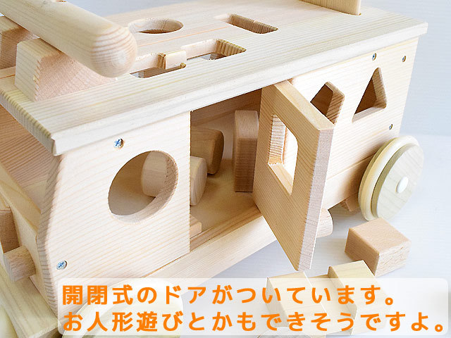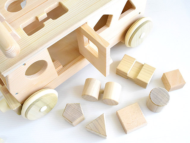 7種類のそれぞれ違った形のブロックが付属されており、それぞれに合った穴が「森のパズルバス」のどこかに開いています。